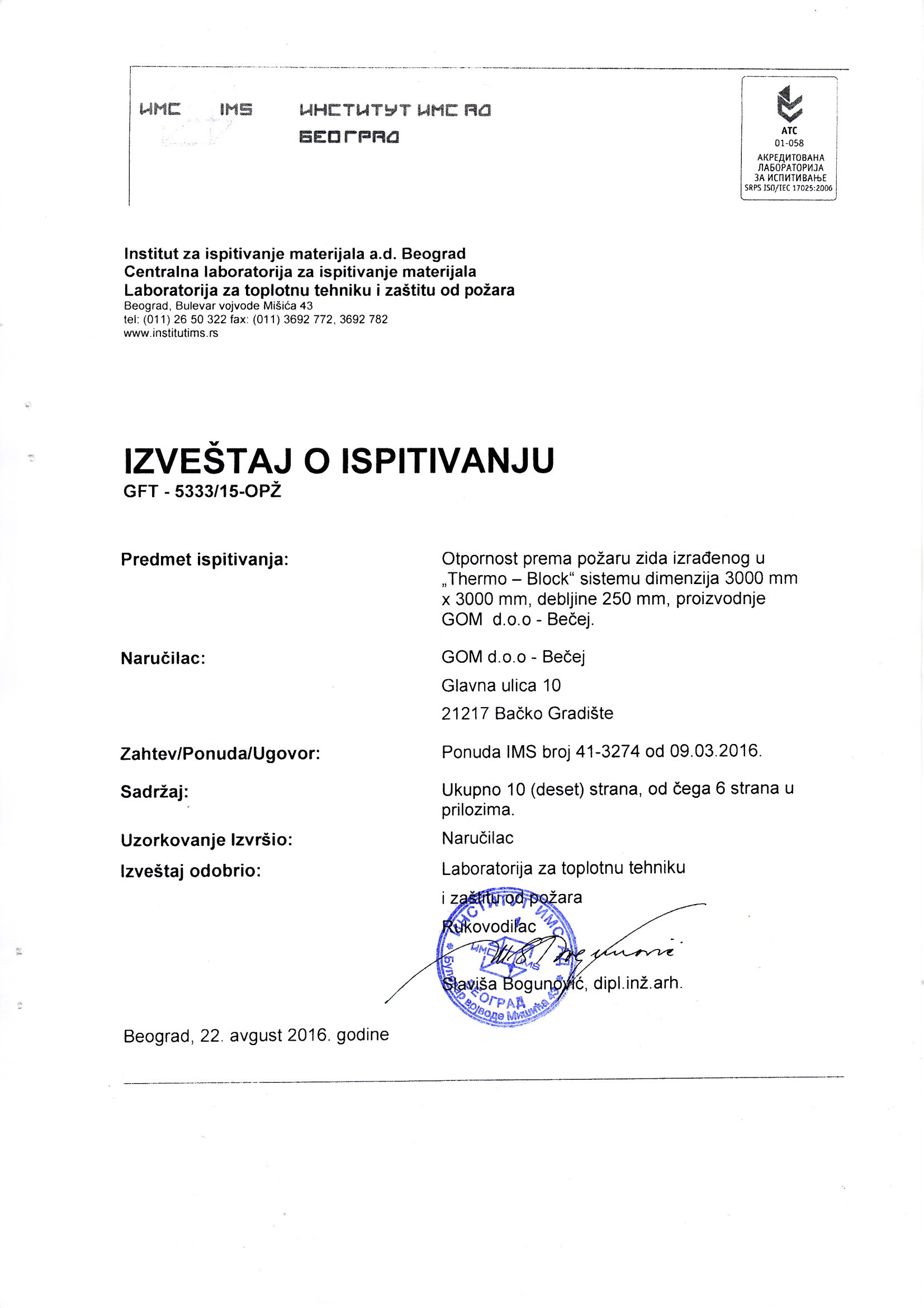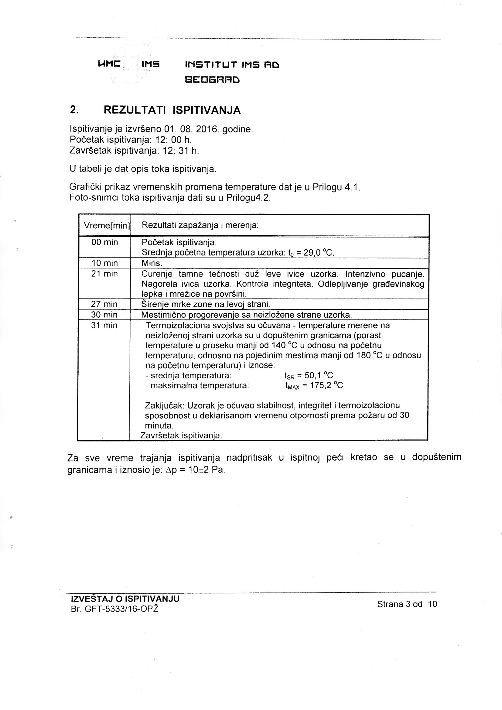 Izveštaj o ispitivanju Br. GFT-5333/16-TOL
